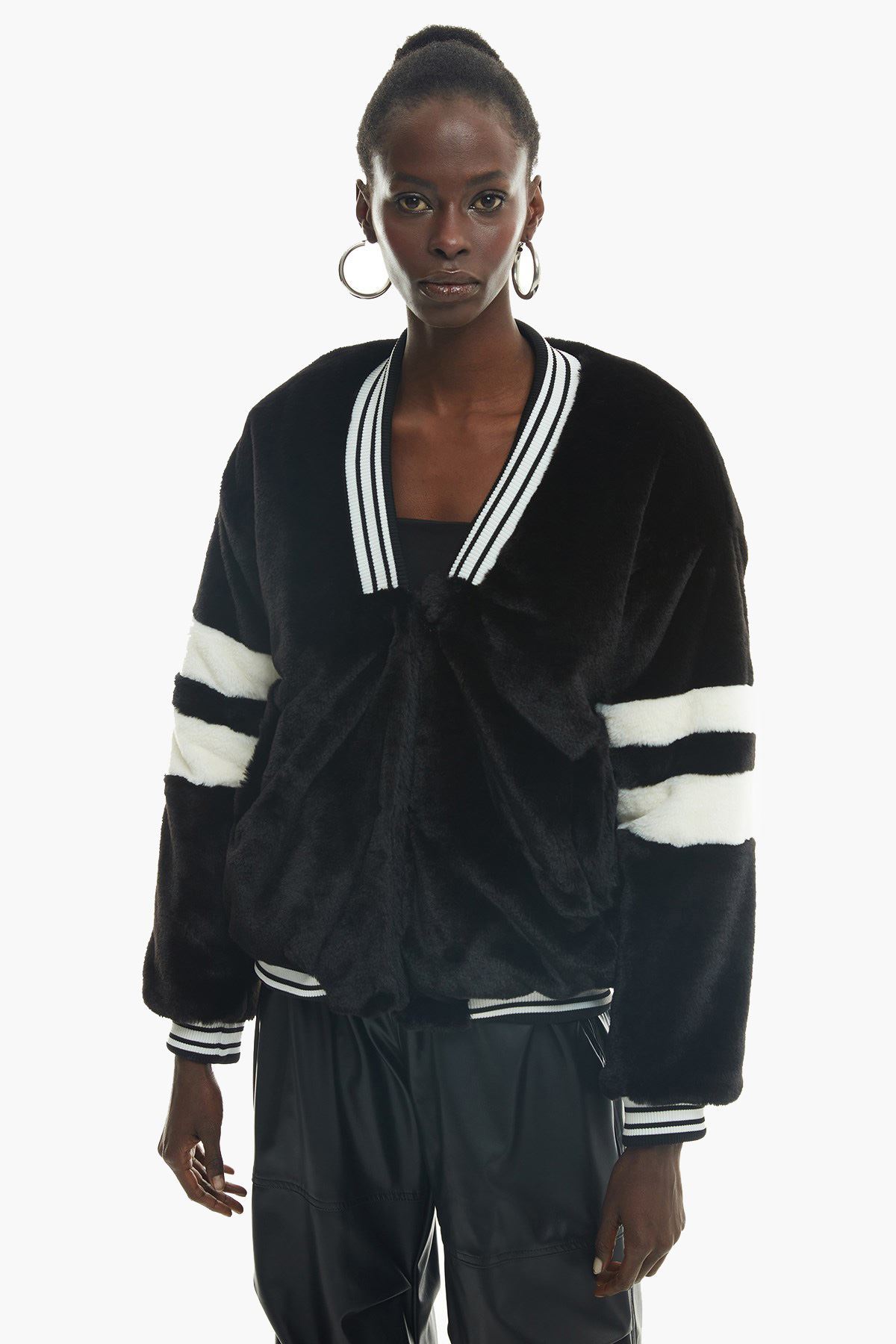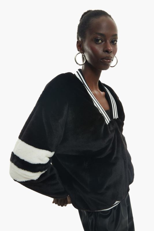 Uzun kollu, önü gizli iliklemeli, içi kapitone, şerit detaylı, yumuşak doku, kısa boy, peluş mont.