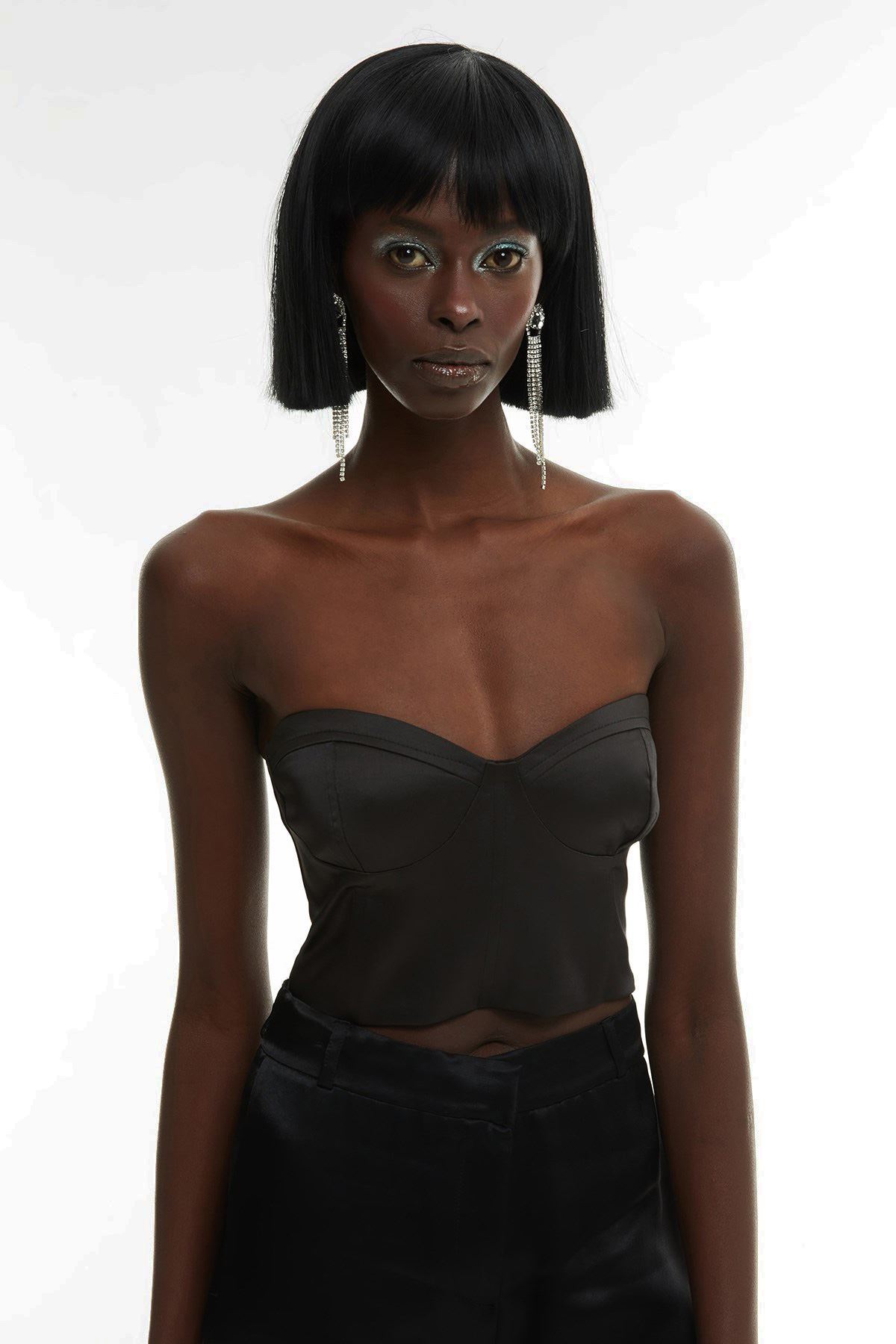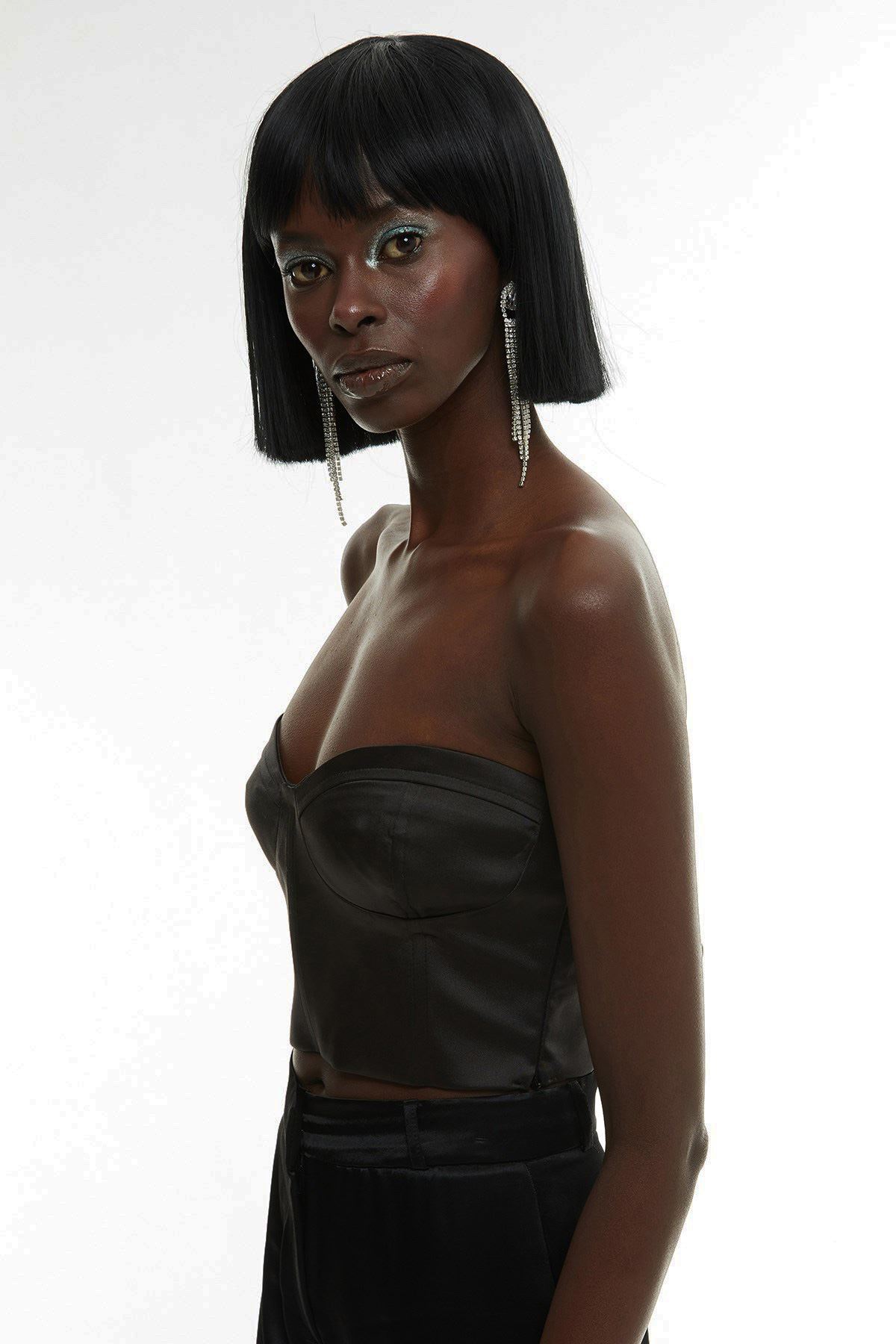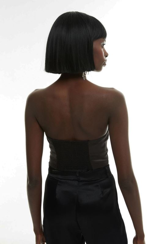 Sırt kısmı gipeli, yandan gizli fermuarlı, hafif parlak doku, crop, straplez saten büstiyer.