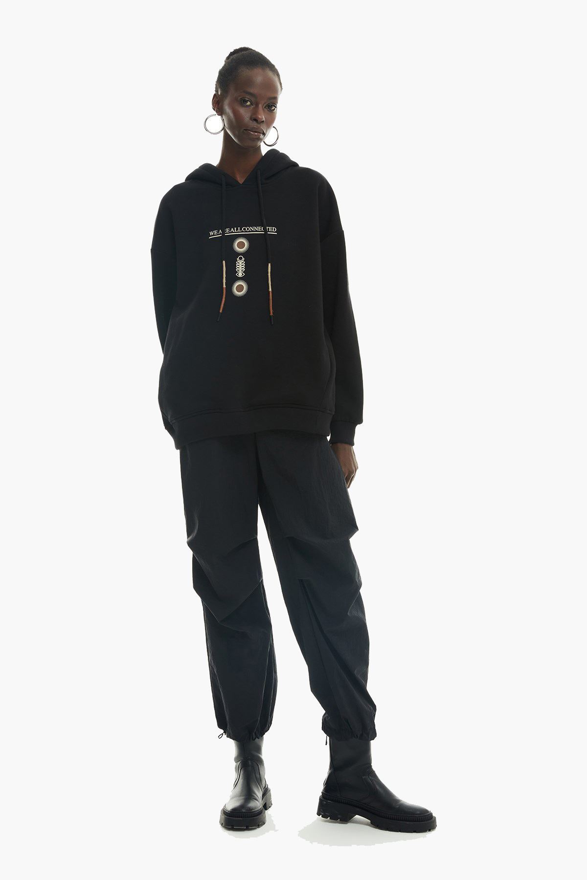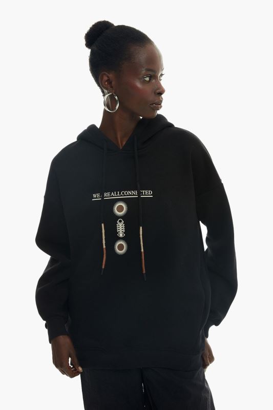 SİYAH SIRTI BASKI DETAYLI KAPÜŞONLU SWEATSHİRT